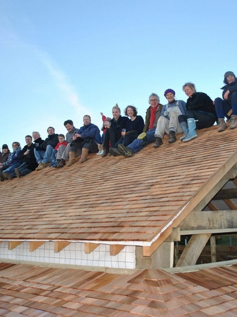 Old Bedalians Matthew Rice, Gabriel Langlands and John Russell were instrumental in designing and constructing the sports pavilion. Members of the Bedales community, past and present, helped with the build, which included nailing down the cedar roof shingles and holding a 'topping out' ceremony - an ancient Scandinavian ritual to appease the spirits of the forest involving mounting an evergreen branch on the structure to symbolize growth and bring good luck.